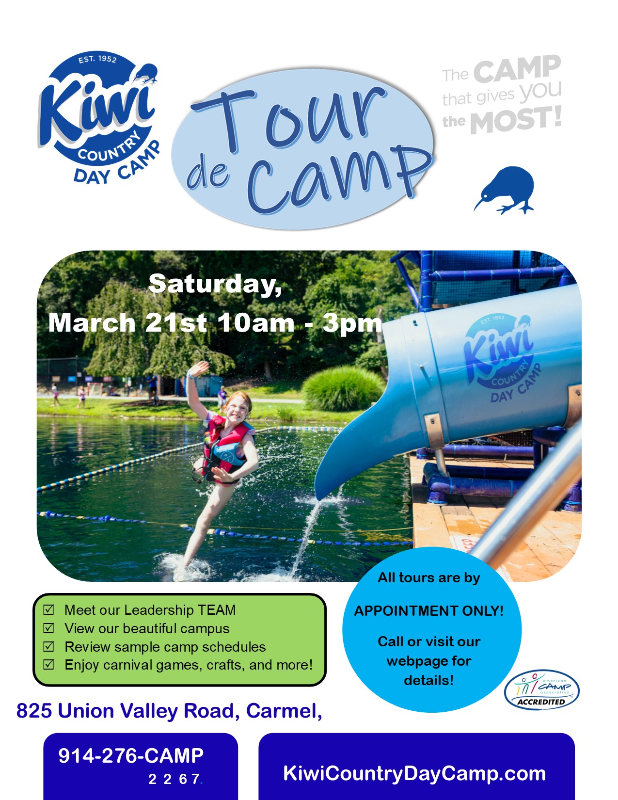 Last call!!! This will probably be our last Tour de Camp before our season (though other days might be available for tours). If you haven’t seen our camp yet, NOW is the time. There is limited availability in many groups and some buses are full, don’t wait any longer. Join us for a fun day at Kiwi Country Day Camp on April 19 ... View Event